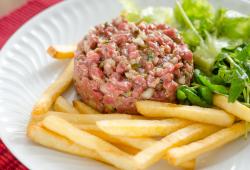 De origem russa-tártara é um prato de resistènce, como dizem os franceses, por causa da digestão da carne crua. Geralmente é prato único, servido frio com batatas fritas e algumas vezes salada.
