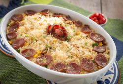 Receita de última hora e aproveitamento daquilo que se encontra na geladeira. Toda casa brasileira que se preze faz algum arroz de forno.