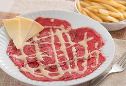 Fatias finas de carne, nem tão finas como o carpaccio que estamos acostumados, temperadas com um molho à base de mostarda e servido com batatas fritas acompanhando.