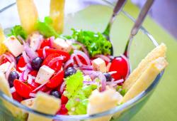 Com um leve toque grego, esta salada cai muito bem nos dias quentes e pode ser um prato único para quem quer um regime.