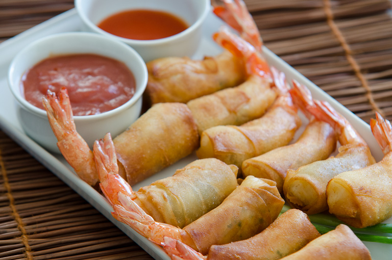 Abra uma massa de rolinho primavera, corte-as ao meio. Com uma das partes, coloque uma colher de chá ou menos no centro da massa, ponha o camarão por cima e dobre a massa entorno do camarão.